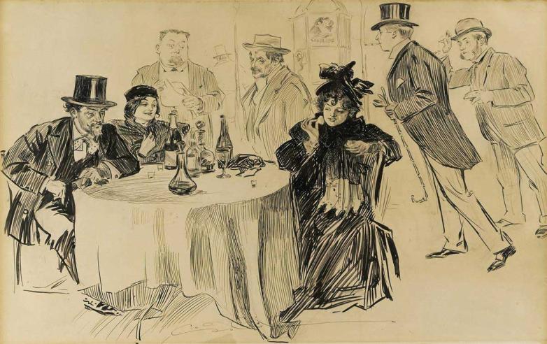 Phillips is one of the most recognizable illustrators of the first half of the twentieth century. His first cover for Life appeared in 1908, the same year he debuted his signature design, which came to be known as “the fadeaway girl.” The fadeaway style refers to Phillips’s masterful use of shapes and edges to suggest a silhouette. In essence, a woman’s figure is rendered with a detailed face, arms, and legs, but the clothing is a solid, flat color that blends into the background. The defined elements are placed within the negative space in such a way as to suggest volume and form.