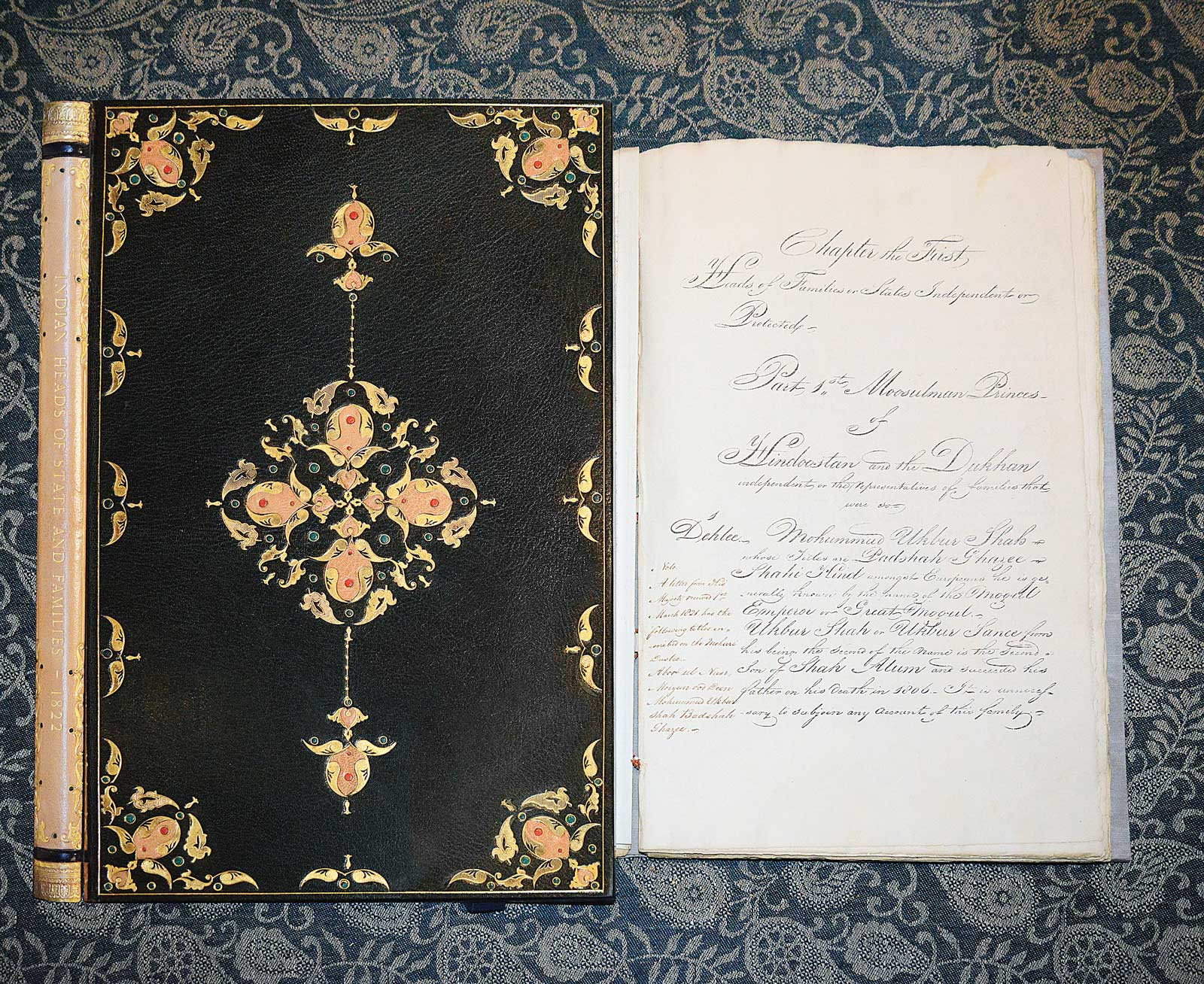 The earliest known lithographic printing from India: a folio, circa 1822, titled Heads of Families in States Independent or Protected. Kossow commissioned a special box from master leather box maker Bill Gardner for it.