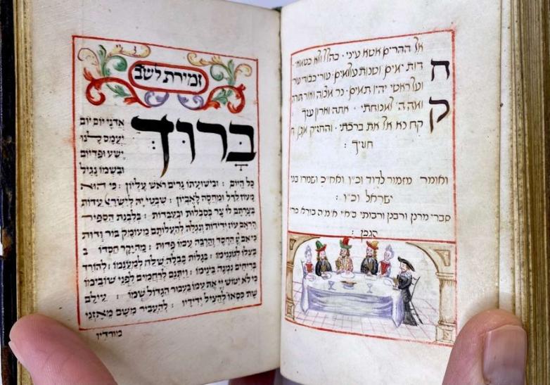 Featured on the decorated title page are Moses holding the Tablets of the Law,  and Aaron, his brother, dressed in high priest vestments. This is a frequent motif in 18th century Hebrew manuscripts and has its roots in the ornamented pages of earlier imprints from Amsterdam and other European printing centres. The animal, celestial and vegetal illustrations enclosed within mauve and blue ink medallions are part of the Perek Shirah hymn. Several illustrations show families around a table celebrating the Sabbath.