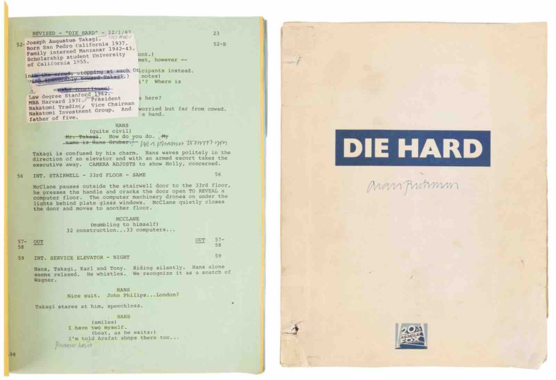 The popular actor extensively annotated the script throughout, highlighting his dialogue and making changes. He also wrote a scene-by-scene script breakdown on the inside-front cover, crossing out the scenes as they were completed. Among loose pieces of paper held within the script ae a call sheet, a memo with updated dialogue for the scene with Mr Takagi (played by James Shigeta) in which Gruber invents the faux Plutarch quote: "And when Alexander saw the breadth of his domain, he wept. For there were no more worlds to conquer", and three pages with dialogue alterations handwritten by Rickman.