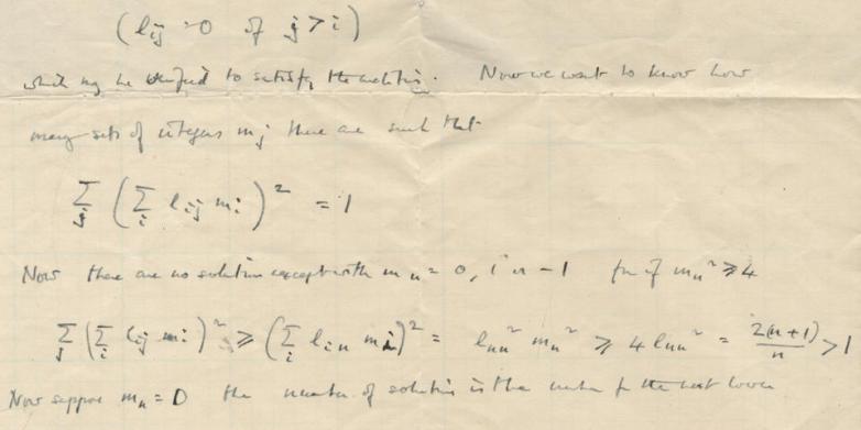 Autograph mathematical calculations setting out and solving a problem in n-dimensional geometry, 2 pages, Bletchley Park, 1941 or 1942.