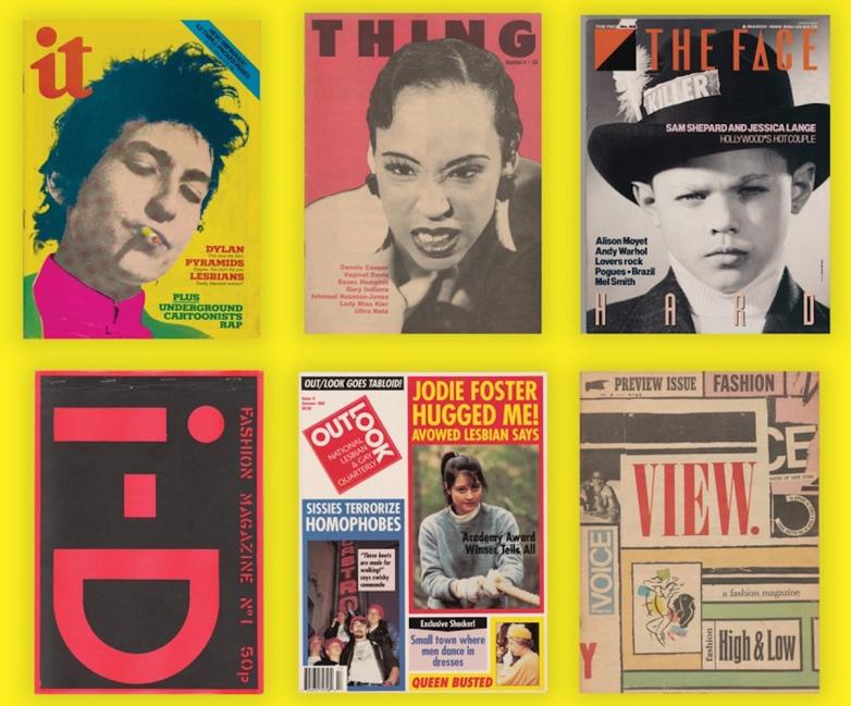 Cover of IT (International Times) magazine, March 9–23, 1972. Private collection. Cover of Thing: She Knows Who She Is magazine, Spring 1991. The Art Institute of Chicago (AIC), Ryerson and Burnham Libraries Special Collections, purchased with funds provided by Eric Ceputis and David Williams. ©THING Magazine. Cover of The Face magazine, March 1985. The AIC, Ryerson and Burnham Libraries Special Collections. Photography ©Jamie Morgan. Cover of i-D magazine, September 1980. The AIC, Ryerson and Burnham Libraries Special Collections. Cover of OUT/LOOK magazine, Summer 1992. Art direction by Skylar Fein. Private collection. ©E.G. Critchton and Jeffrey Escoffier, founders, OUT/LOOK Magazine. Cover of View: A Fashion Magazine, April 1985. The AIC, Ryerson and Burnham Libraries Special Collections. ©Yolanda Cuomo.