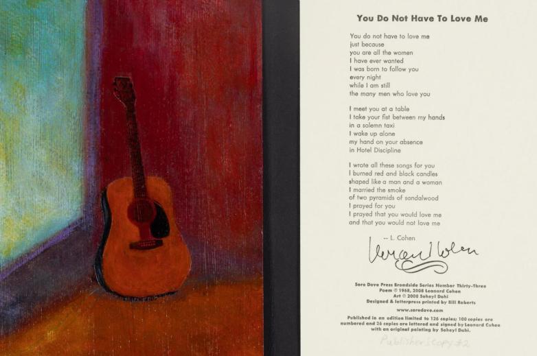 You Do Not Have To Love Me, signed letterpress poem by Leonard Cohen with an original painting by Soheyl Dahi, one of 26 copies. Estimate: $2,000-3,000