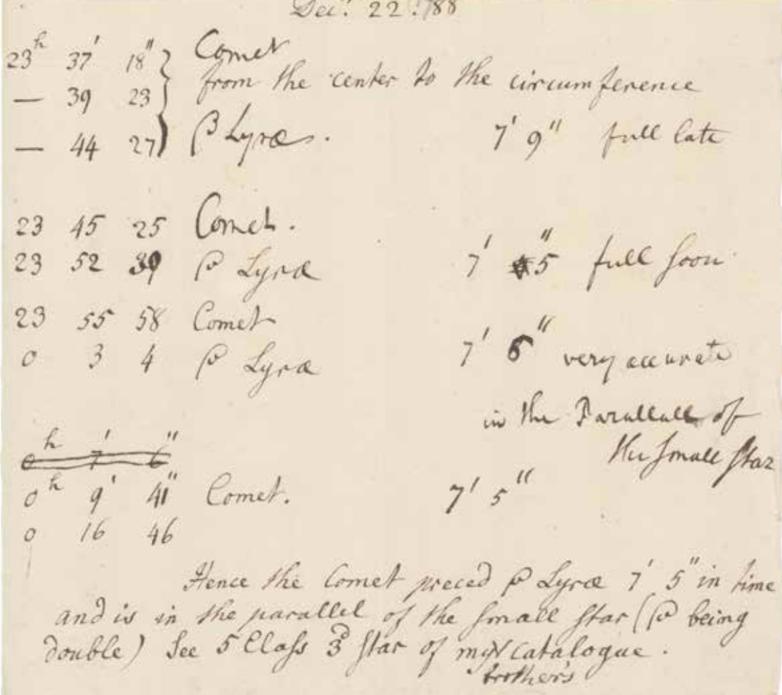 * Caroline Herschel, autograph manuscript observations of her discovery of a comet. In this wonderful scientific manuscript Caroline Herschel records her observations of her newly-discovered comet, known today as 35P/Herschel-Rigollet. Caroline Herschel manuscripts are very rare in the market. Only one letter—and no scientific manuscripts—appears in the auction records of the past fifty years.