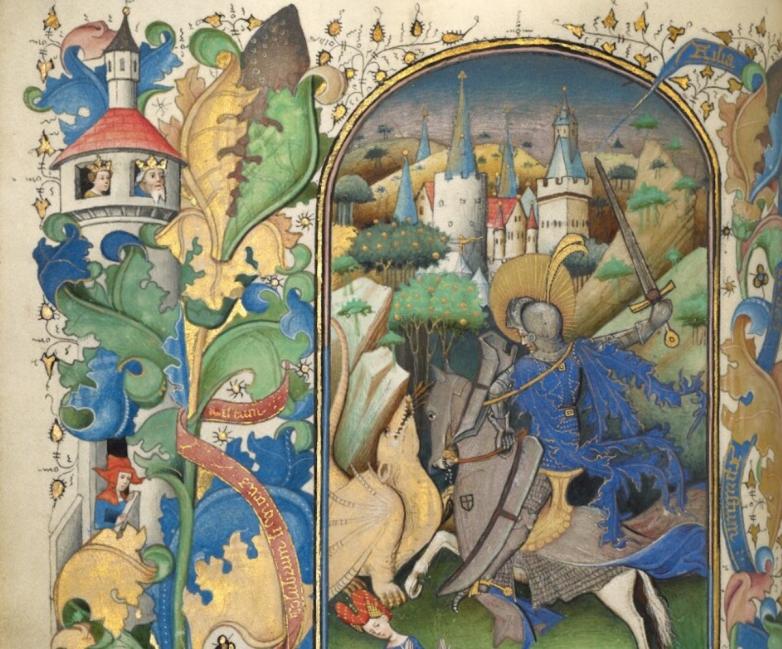Detail from Saint George and the Dragon, about 1450– 55, Master of Guillebert de Mets (Flemish, active about 1410–50). Tempera colors, gold leaf, and ink on parchment.