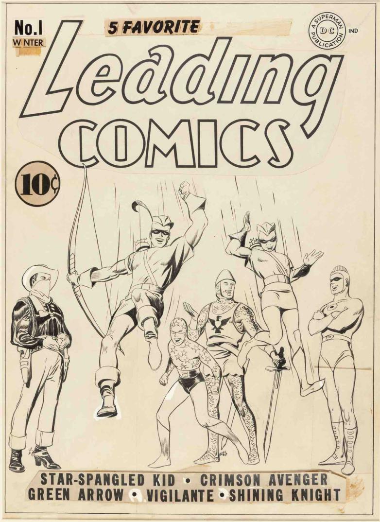 Mort Meskin's original cover for 1941's Leading Comics No. 1, featuring the Seven Soldiers of Victory, and Fred Ray and Jerry Robinson's cover for Batman and Robin's Detective Comics No. 58 (inside which The Penguin waddled his first steps) lead Heritage Auctions' September 14-17 Comics & Comic Art auction.