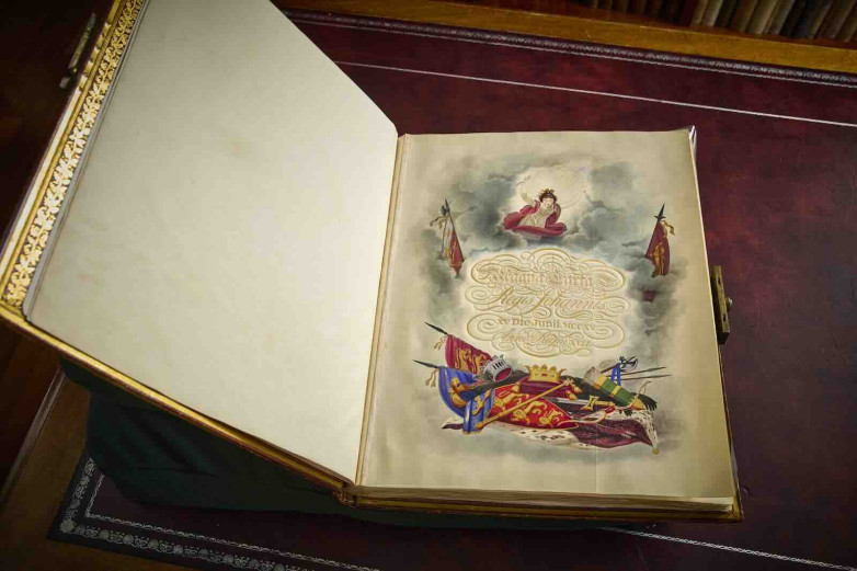 Every aspect of this extra-illustrated copy printed on vellum was lavish and expensive. The illumination and decoration were executed by several artists including T. Aickin, John Harris, and Richard Thomson. Overall supervision was entrusted to Thomas Willement, heraldic artist to George IV, who had special responsibility for heraldic accuracy.