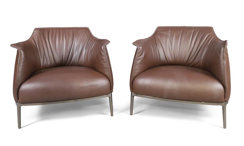 Jean-Marie Massaud for Poltrona Frau, a pair of Archibald lounge armchairs, c.2001, brown leather upholstery, on chrome base and legs, estimate £1,000 - £1,500