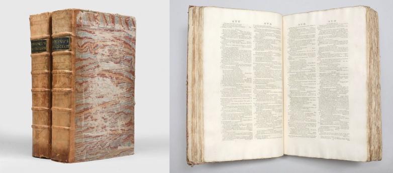 Samuel Johnson’s A Dictionary of the English Language, one of the very few first edition copies surviving uncut and intact in bookseller’s boards (1755), offered at £275,000.