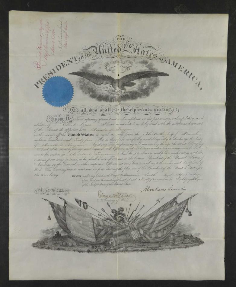 Civil War-era military appointment dated April 6, 1864, signed by President Abraham Lincoln and promoting Elliot Loues to Assistant Surgeon, est. $4,000-$6,000.