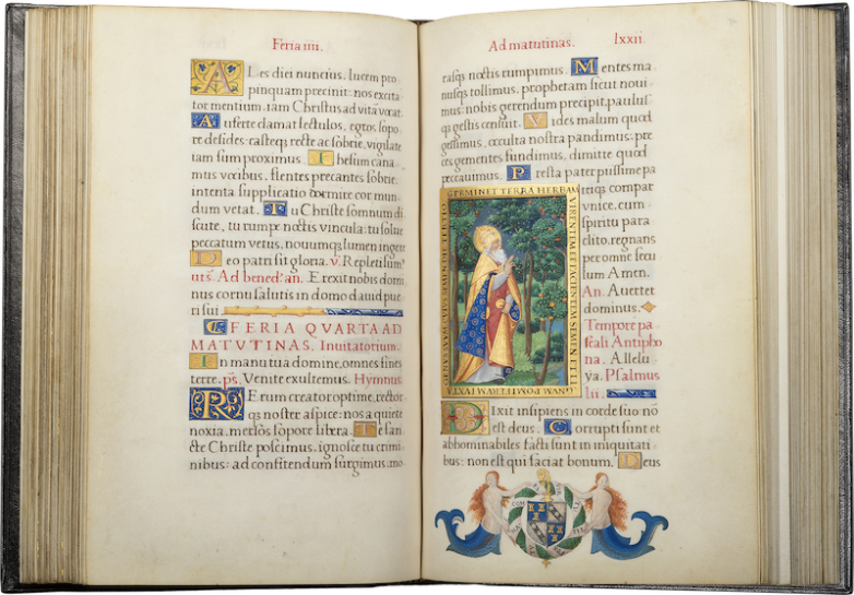 From Les Enluminures, an illuminated manuscript: Psalter of François de Dinteville. In Latin, Illuminated manuscript on parchment. 9 large miniatures, by the Workshop of Étienne Colaud. France (Auxerre or Paris), c. 1525. This extremely refined and sophisticated manuscript was made at the height of the French Renaissance for bishop François de Dinteville, uncle of the ambassador Jean de Dinteville famously depicted in Hans Holbein’s portrait The Ambassadors. Price on request