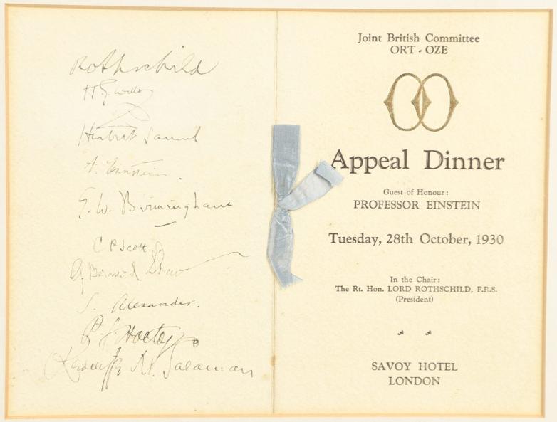 "Against this tide, the Joint British Committee of the Societies Ort-Oze for promoting the Economic and Physical Welfare of East-European Jewry was established. At the invitation of this cause, Albert Einstein made a trip to London as the guest of honour at a special appeal dinner at the Savoy organised by Chairman of the committee, The Rt. Hon. Lord Rothschild."