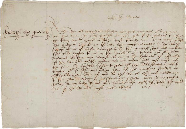 A widow herself, and aged 31 at the time, Katherine was initially noticed by the King as part of the household of his eldest daughter, Princess Mary. Ambivalent about marrying an unpredictable King, who had executed his previous wife Catherine Howard only 18 months prior, she knew rejecting Henry was unthinkable, but that the marriage would bring great benefit to her family, with her brother William (1513-71), the recipient of this letter, elevated to the Earldom of Essex.