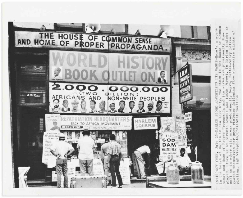 The March 19 auction includes this exterior wire photograph view of Lewis Michaux's African National Memorial Bookstore, a Harlem institution from 1932 to 1974 (New York, July 23, 1964)