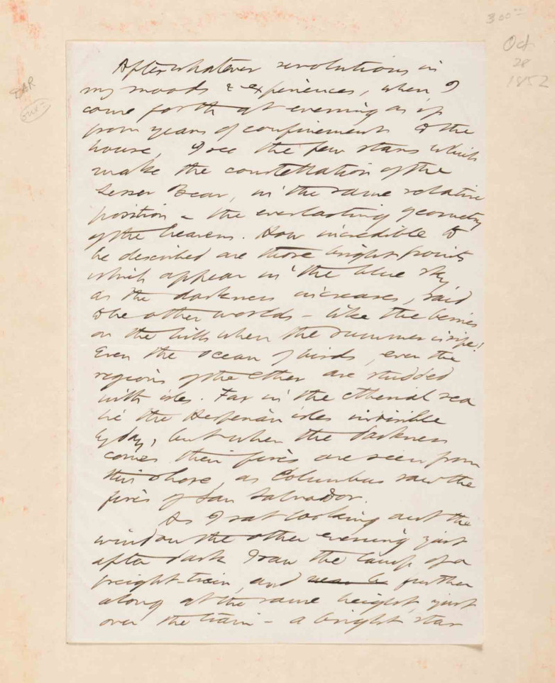 The one-page fragment from his entry for October 28, 1852, is written in dark brown ink and comes from a passage in the journal headed "8 p.m. To Cliffs" in which he compares the many stars in the sky to the ripe summer berries: