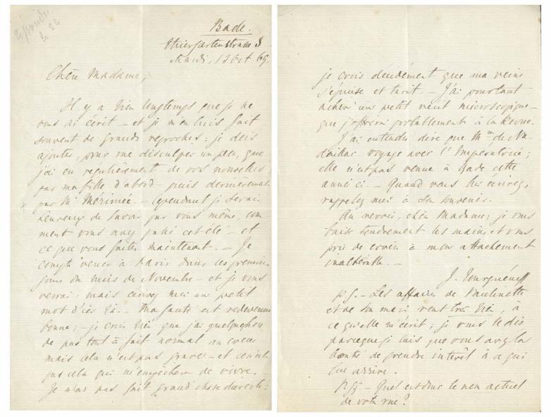 The letter in French reads in part: ''Dear Madam, It has been quite a while since I have written to you - and I have often greatly reproached myself for it; I have to add, to excuse myself somewhat, that I have received news of you regularly, first from my daughter, then later from Mr. Merimee. Nonetheless, I would be happy to hear directly from you how you have been this summer - and what you are doing now. I intend to come to Paris in the first days of November - and I will see you…I definitely think that my productive vein is running out and drying up. I have, however, completed a microscopically small story - which I will probably submit to the Revue…”