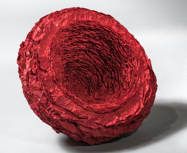 Echiko Ohira, Untitled (red #1), 2018; Paper, acrylic, wire, and glue, 15 x 17 x 16 in.