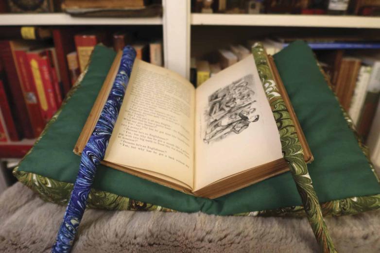 It used to be surprisingly difficult to find high-quality, nevermind handsome, book supports to cradle rare volumes while perusing or showcasing them, but not anymore! Here we have a wedge-shaped pillow and a weighted book snake, fashionably handmade by Allie Alvis, aka Book Historia, aka rare book cataloguer at Type Punch Matrix, in various shades of color-fast cotton or polyester. (The marbled fabric is quite lovely.) Both items secure fragile volumes in the way recommended by book conservators. $50-60/pillow. $11/snake