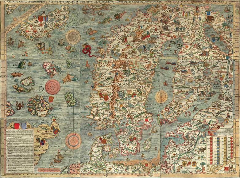 Disappointed with the maps of Scandinavia that were circulating throughout Europe in the early sixteenth century, Olaus Magnus (1490–1557) set out on a twelve-year quest to map the region to a level of detail that was exceptional. Published in 1539, his beautifully colored and richly decorated Carta Marina was the first large-scale map of any part of the European continent. In its day, Magnus’ map became a major source of iconography on sea monsters and a source of inspiration for other cartography on Northern lands, like that created by Abraham Ortelius (1527–1598) and Sebastian Münster (1488–1552).