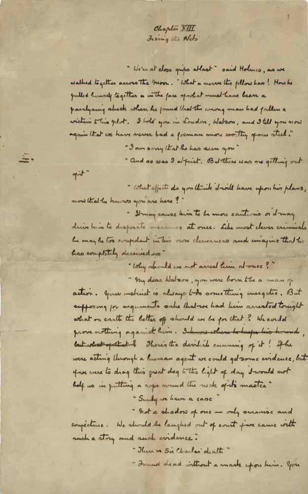 To promote the Baskersvilles book, the American publishing house McClure, Phillips, and Co. asked Doyle for the original manuscript, and they developed a publicity campaign in which individual book dealers each received one of the pages written in Doyle’s hand. Few of those pages survive today, however one will be available for sale at an upcoming Calabasas, California auction from Profiles in History.