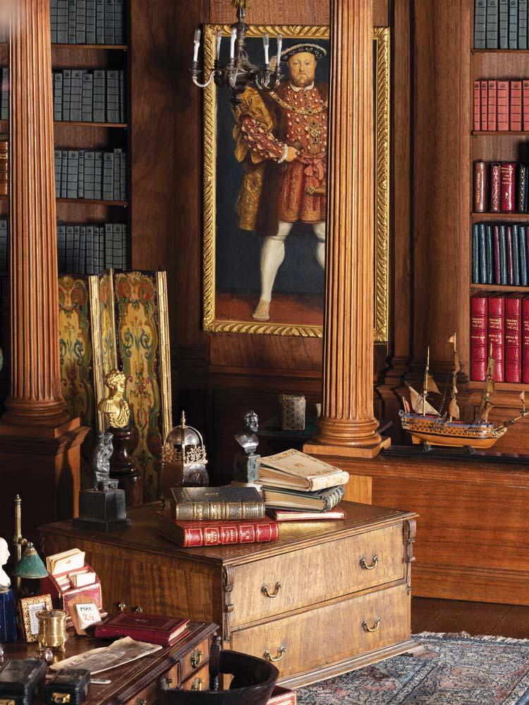 As well as a doll-sized leather-top desk, ivory paper knife, leather-upholstered armchairs, and miniature bronze busts of German writers Friedrich Schiller and Johann Wolfgang von Goethe, the library is stocked with 595 miniature books, 176 of which are handwritten manuscripts. These were commissioned by the Princess and her friend, the writer E. V. Lucas, from the country’s leading authors, including Max Beerbohm, A. A. Milne, and J. M. Barrie. Edith Wharton also contributed an original poem, Elves’ Library. The writers were sent four-centimeter-high blank notebooks in which they wrote their contributions. (Rudyard Kipling also decorated his selection of verses with pen-and-ink drawings.) The notebooks were then bound by Sangorski & Sutcliffe, Rivière & Son, Zaehnsdorf, and Birdsall & Son in leather with gold tooling and finished with bookplates designed by E. H. Shepard.