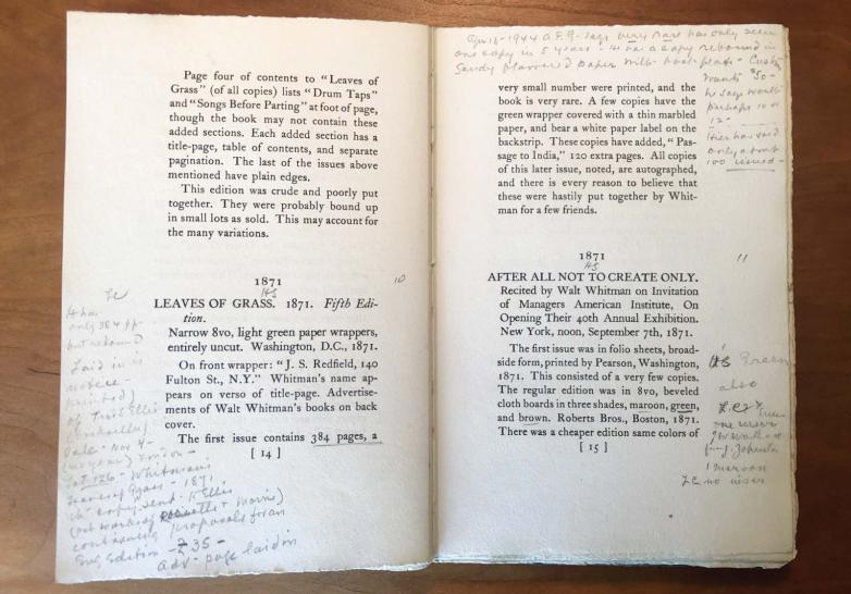Whitman collector Harriet C. Sprague annotated this copy of A Concise Bibliography of the Works of Walt Whitman, With a Supplement of Fifty Books About Whitman (Boston and New York: Houghton Mifflin Company, 1922) by Carolyn Wells and Alfred P. Goldsmith. It was also inscribed by the authors to Sprague.