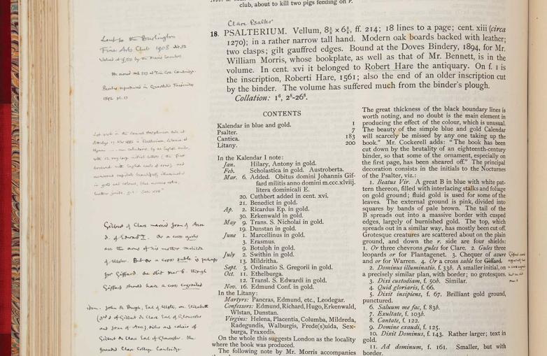 Manuscript annotations by Sydney Cockerell, director of the Fitzwilliam Museum in Cambridge, England, from 1908 to 1937, are in this copy of Catalogue of Manuscripts and Early Printed Books from the Libraries of William Morris, Richard Bennett, Bertram Fourth Earl of Ashburnham, and Other Sources: Now Forming Portion of the Library of J. Pierpont Morgan: Manuscripts by M. R. James (London: Chiswick Press, 1906).