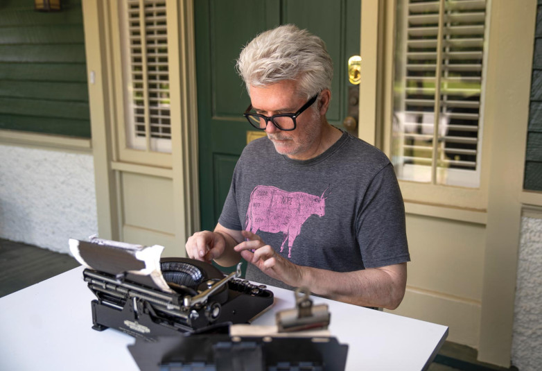 He focuses on books written in English on typewriters. His studio in Los Angeles houses at least one hundred typewriting machines. To determine the make and model used by an author whose work he is retyping, he studies photographs, researches online, visits author archives, and interviews family members and biographers. He has even consulted a man, now deceased, who specialized in ransom note forensics for the FBI. “My standard is artistic, not necessarily scholarly,” Youd explained.