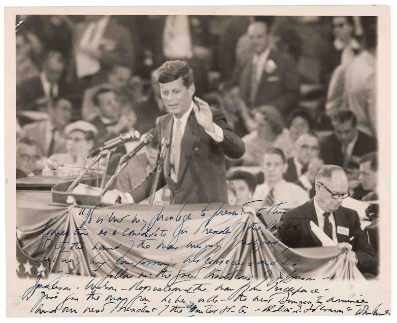 John F. Kennedy signed photograph, quoting from his Address nominating Adlai Stevenson at the 1956 DNC: "In the great traditions of Jefferson, Jackson, Wilson, Roosevelt and the man from Independence, I give you the man from Libertyville"