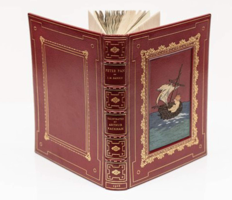 J. M. Barrie's Peter Pan ,bound in full red Morocco with a multi-colored onlay on front cover by Sangorski & Sutcliffe. Illustrated and signed by Arthur Rackham. Offered by Imperial Fine Books.